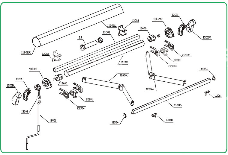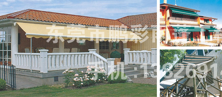 BH102半盒曲臂式遮阳蓬,其特征在于遮阳面料能被纳入罩壳内,工作是使用机械装置和曲臂装置系统,在弹簧的作用下,产生伸缩张力, 整个曲臂组由臂止动件实现8~70度任意精确平行调整。可通过不同传动系统:手动曲柄操纵、电机操纵。结构骨架采用高强铝合金/锌合金/ABS树脂/优质钢材/聚丙烯PP制成。而螺栓和螺丝均由优质钢材制成。可适用于混凝土、砖墙、木质、轻钢龙骨等硬型墙体安装,还可以实现吊顶安装。最大适用长度6.00米,最大适用伸出长度为3.00米。