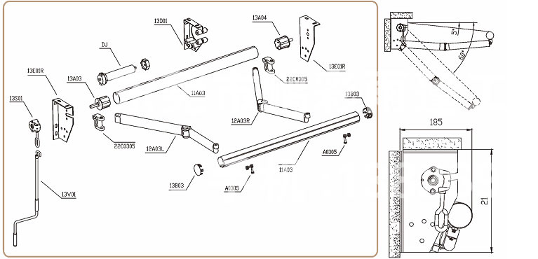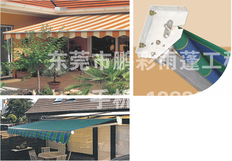 A03曲臂式遮阳蓬,工作是使用机械装置和曲臂装置系统,其特点简单,紧凑牢固。在弹簧的作用下,产生伸缩张力,整个曲臂组可实现5~60度任意精确平行调整。可通过不同传动系统:手动曲柄操纵、电机操纵。结构骨架采用高强铝合金/优质钢材/ABS树脂等制成。可适用于混凝土、砖墙、木质、轻钢龙骨等硬型墙体安装,还可以实现吊顶安装。最大适用伸出长度为3.00米。