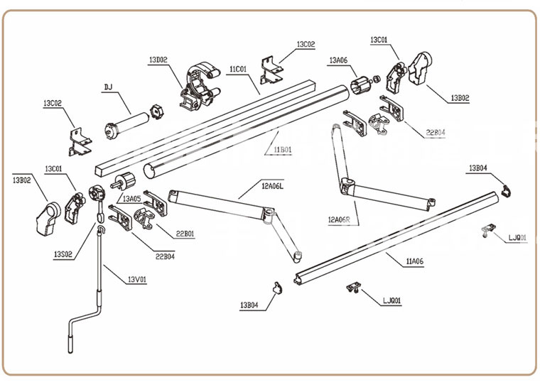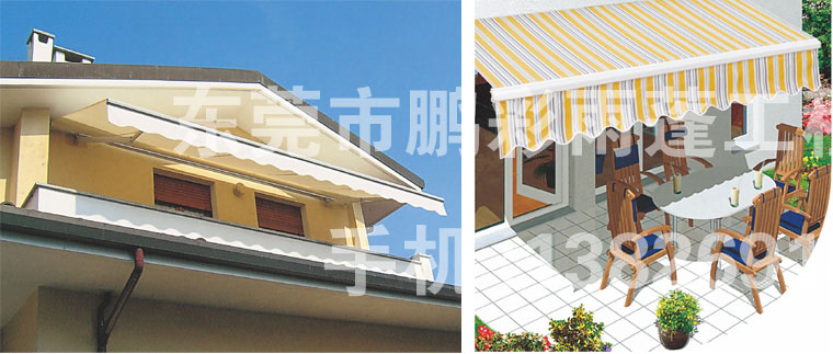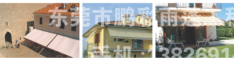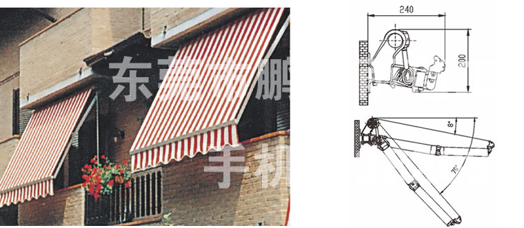 A06曲臂式遮阳蓬,工作是使用机械装置和曲臂装置系统,在弹簧的作用下,产生伸缩张力,整个曲臂组由臂止动件实现8~70度任意精确平行调整。可通过不同传动系统,手动曲柄操纵、电机操纵。结构骨架采用高强铝合金/优质钢材/锌合金/ABS树脂/聚丙烯PP/尼龙等制成。而螺栓和螺丝均由优质钢材制成。可适用于混凝土、砖墙、木质、轻钢龙骨等硬型墙体安装,还可以实现吊顶安装。最大适用伸出长度为3.000米。