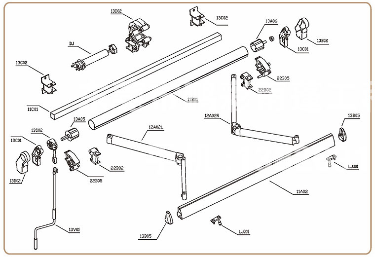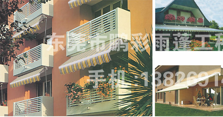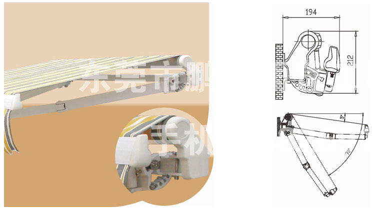 0263曲臂式遮阳蓬,工作是使用机械装置和曲臂装置系统,在弹簧的作用下,产生伸缩张力,整个曲臂组由臂止动件实现5~70度任意精确平行调整。可通过不同传动系统:手动曲柄操纵、电机操纵。结构骨架采用高强铝合金/锌合金/优质钢材/ABS树脂/聚丙烯PP制成。而螺栓和螺丝均由不锈钢制成。 可适用于混凝土、砖墙、木质、轻钢龙骨等硬型墙体安装,还可以实现吊顶安装。最大适用伸出长度为3.50米。
